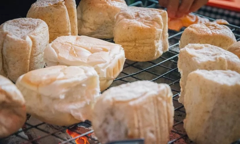 碳烤麵包做法是把配料放進中心(夾心),然後用碳火燒烤。