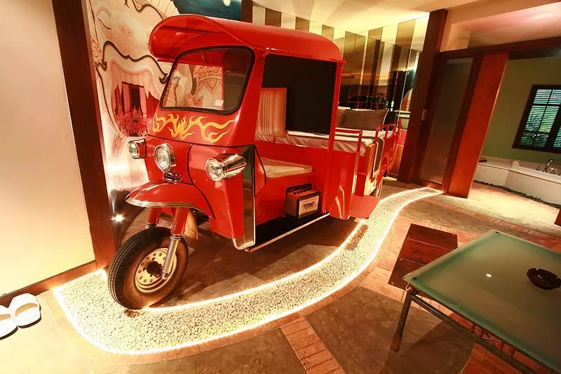 tuk-tuk 車套房(Executive 217號),嘟嘟車後座進行改裝,鋪成一張大床,讓房客可以舒服的在上面睡覺,很有泰國特色,房價每晚2000-3000銖。