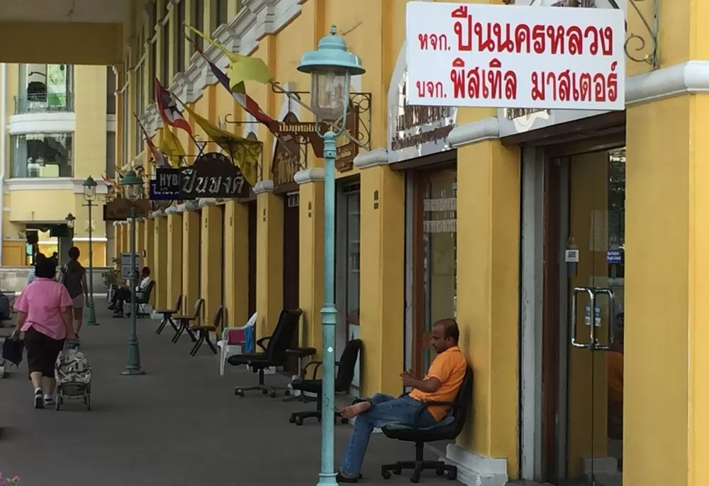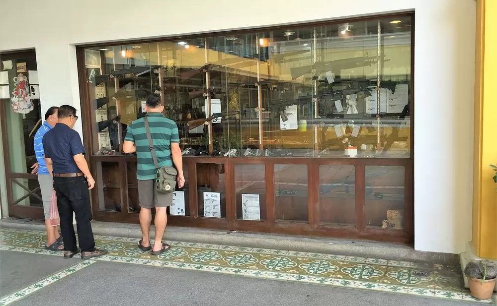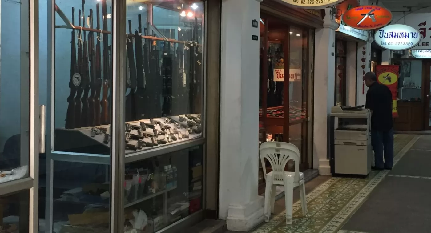 除此之外,舊暹邏廣場獨一無二的大賣點是有很多槍店,賣的是真槍(手槍和步槍)和子彈,店家不能販售給外國觀光客,當地人需持身份證件(無犯罪紀錄,且用於家裡自我防衛)才有資格購買,不過參觀一下也無妨(注意:店內禁止攝影)。