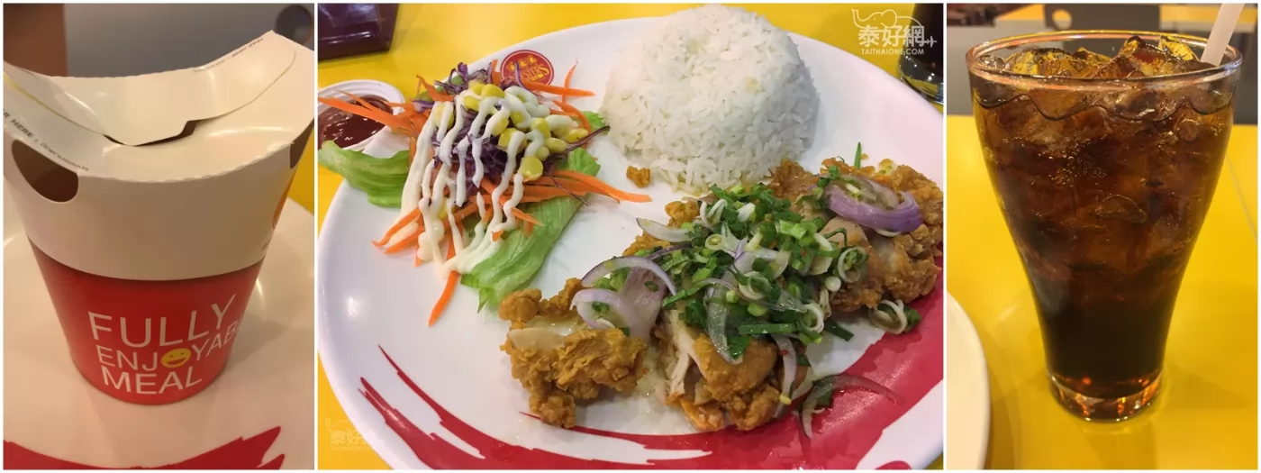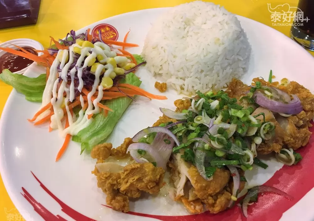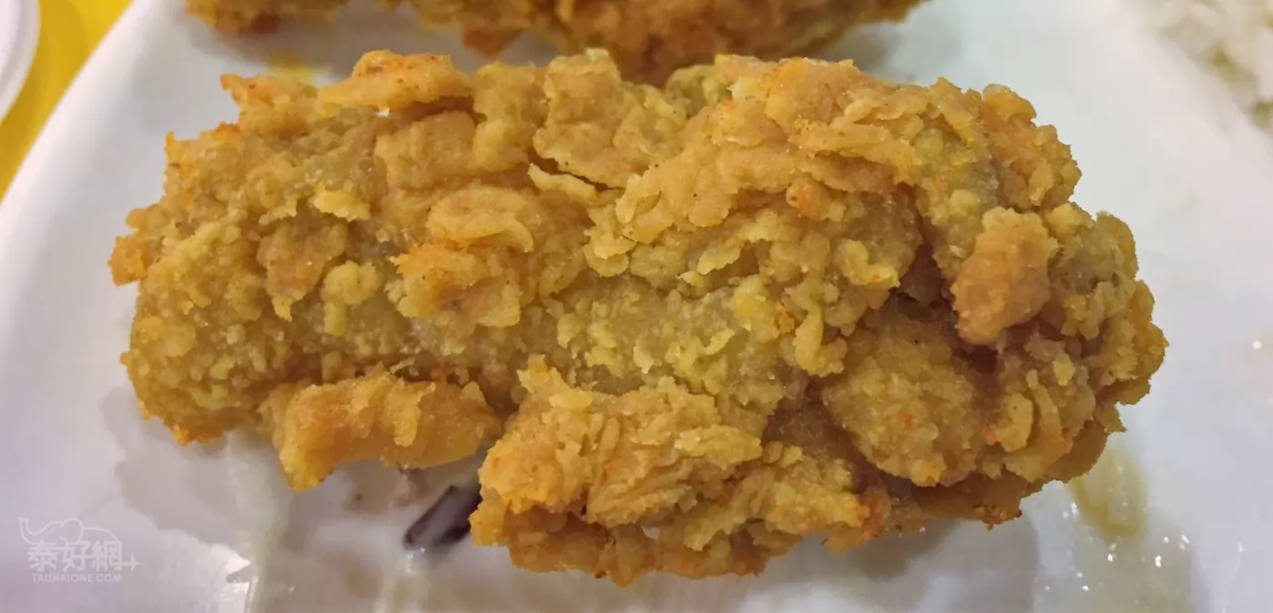 這還不夠象哥吃,於是又加點酸辣雞塊(兩塊32銖),炸雞的味道和其他速食店差不多,但是多了點酸和辣,更對了泰國人的胃。