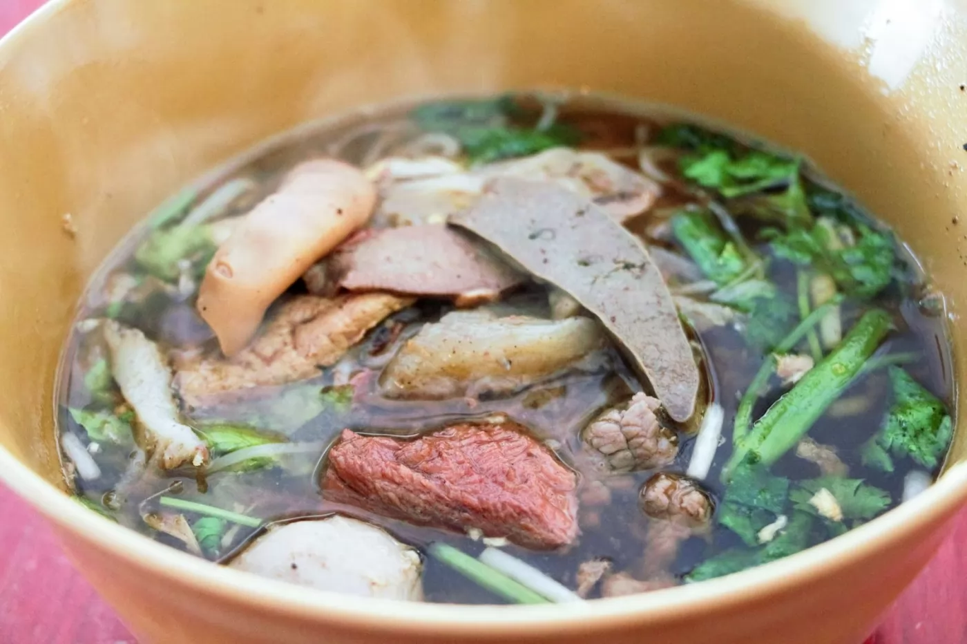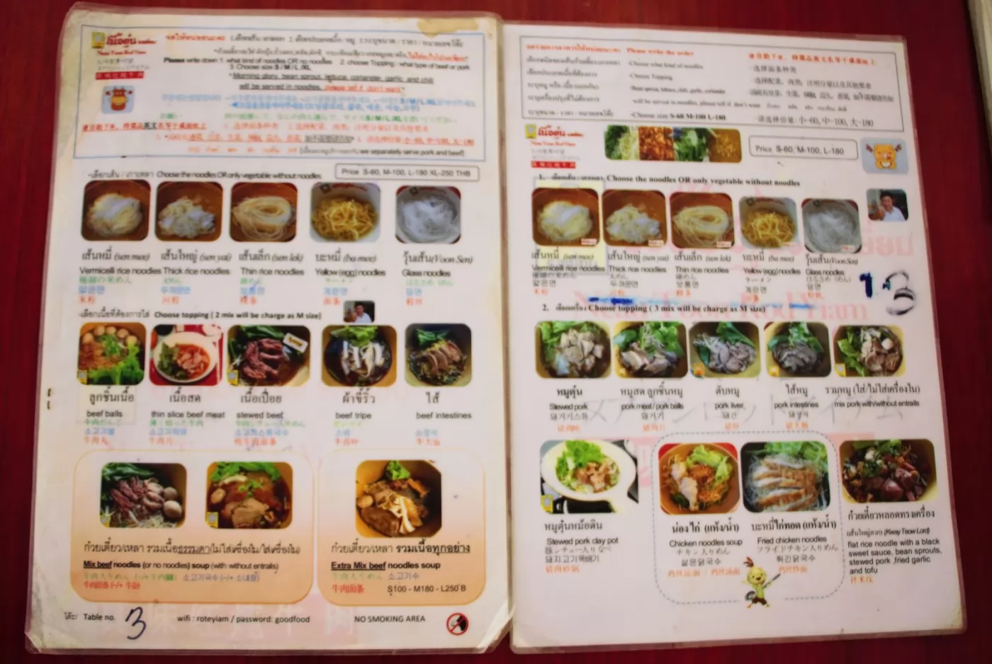 這裡的選擇很多種,基本上有「牛腩(筋)、牛雜和牛肉」,可以搭配麵、粿條、米粉和飯,一般價位小碗60銖、中碗100銖、大碗180銖;牛肉麵不同於台灣的紅燒牛肉麵,紅燉的牛肉和消甜的湯,吃起來的味道就不一樣,小碗100銖、中碗180銖、大碗250銖。