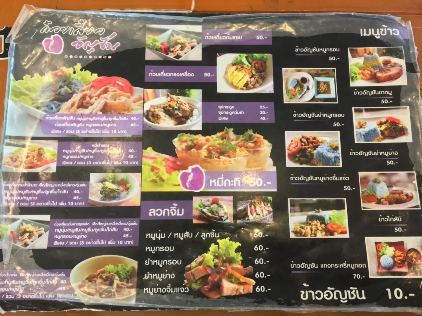 Menu有泰、英文和圖片,Roti、蛋糕、冰淇淋、吐司、義大利麵和套餐飯食等。