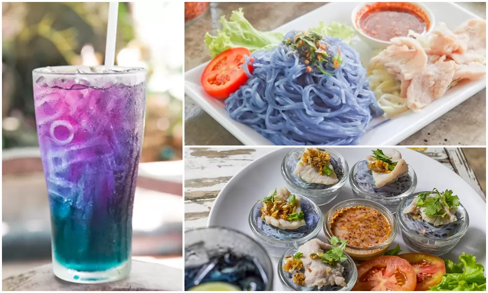 這裡的每一款食物都有蝶豆花的因素,顏值非常高,深受當地年輕人歡迎,消費並不高,口味也還不錯。蝶豆花粿條(ก๋วยเตี๋ยวอัญชัน)1盤40銖。染成藍色的粿條可以搭配豬肉片、豬肉末、泰北酸肉、烤豬肉等等,還附上一碟香辣的蘸料。