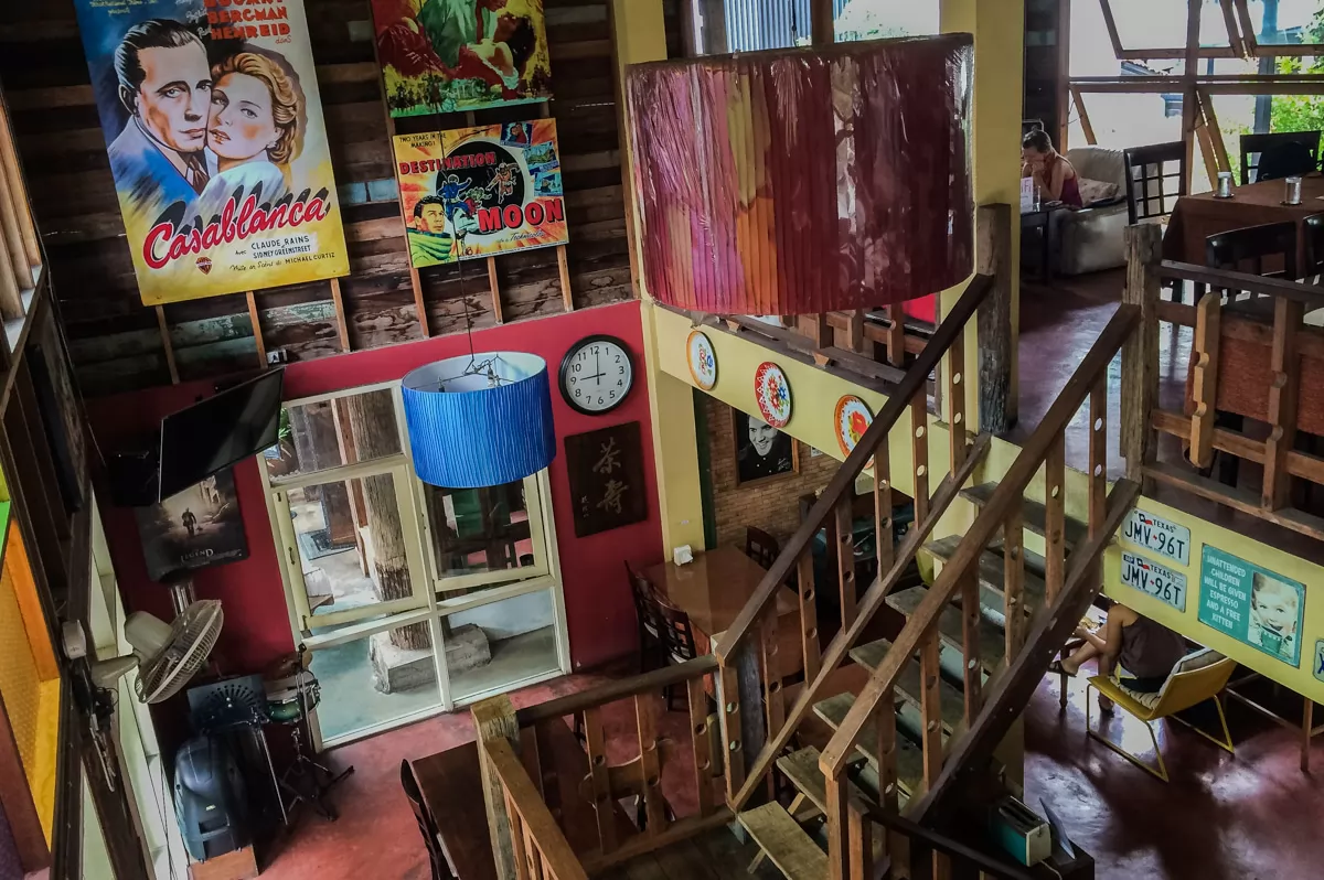 外觀是下層水泥上層木板的兩層屋,裡面各個角落都散落著設計精美的舊物,窗邊一排餐桌的風格也滿滿的復古氣息,再配上斑駁的紅地板,色彩繽紛,充滿活力!