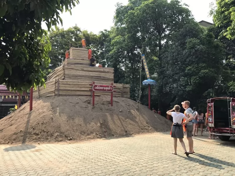 佛寺入口處,節日時會堆起巨型的沙塔,插上小旗子,裝點出佛教節日的氣氛。