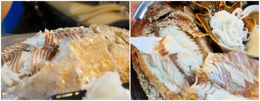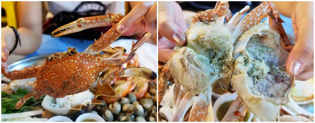 大碳烤海鮮拼盤中,有1隻大螃蟹、1條鹹魚、多隻河蝦、1條花枝、多個蚵、蛤蜊、蠔,經過炭火烤熟的海鮮異常美味,配上酸辣醬汁,讓人欲罷不能!
