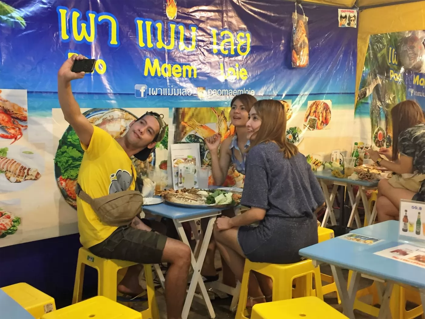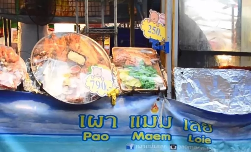 火車夜市(ตลาดนัดรถไฟ รัชดา;Train Night Market Ratchada)裡,Pao Maem Loie(เผาแม่มเลย)專做烤海鮮的小店,遠近聞名。每天吸引著國內外食客光顧,去晚了還得排隊!