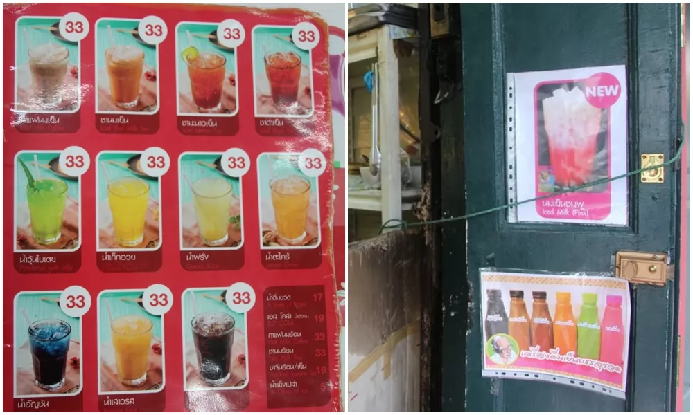 當然,天熱的曼谷少不了要點杯飲料,檸檬茶、泰式奶茶、香蘭葉汁、泰式冰黑咖啡O涼等1瓶約33銖,也有礦泉水和可樂可選。