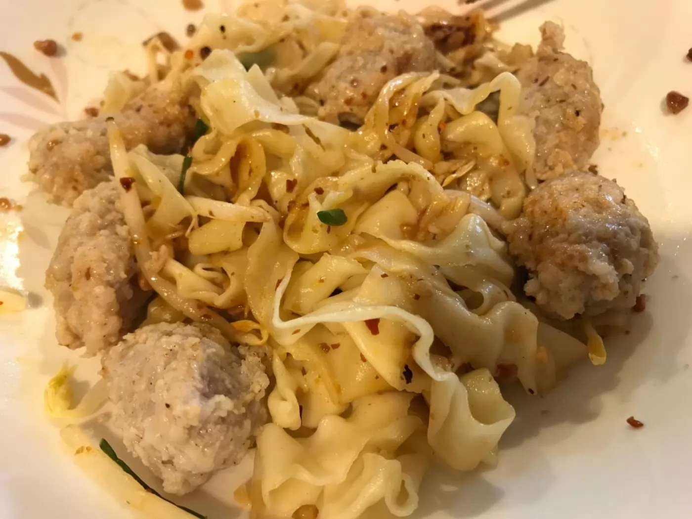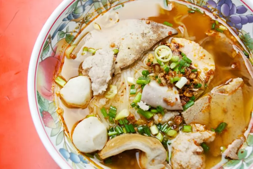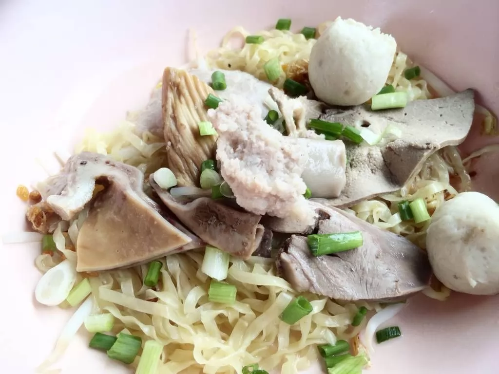 這邊提供很多種豬肉配料來搭配麵、粿條。你可以選擇任何你想要的:豬肉、豬肝、魚丸等。當然,在所有的配料裡,你絕對不能錯過的、最美味的東西,就是這裡特製的豬肉丸(หมูบะช่อ) 。