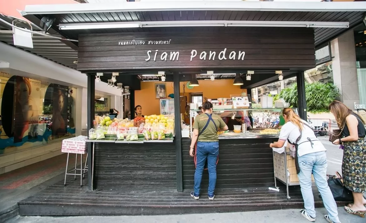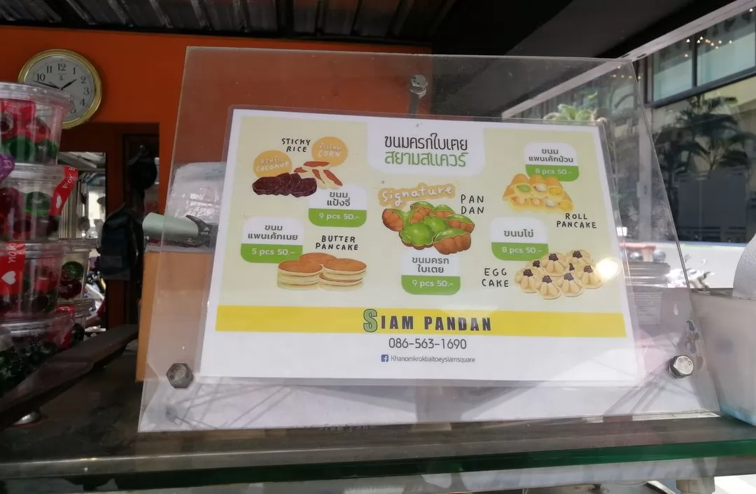 雖然只是很普通的小吃,但現在想找到這樣的小吃攤可不容易,最方便的是在SIAM SQUARE第5巷這家SIAM PANDAN(ขนมครกใบเตย สยามสแควร์ 5),賣超過30年了,也賣出了名號,店雖小,好吃的甜點卻很多種。