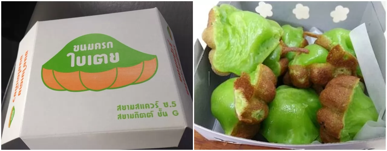 香蘭葉椰奶撻,原料是木薯粉、糖、麵和椰奶,再混合香蘭葉(ใบเตย)汁,草綠色,把攪拌均勻的面糊倒入花狀模具中,待熟透後取出,因為模具的不同,做出來的香蘭葉椰奶撻有大有小、價格也不一(1個3-10銖)。