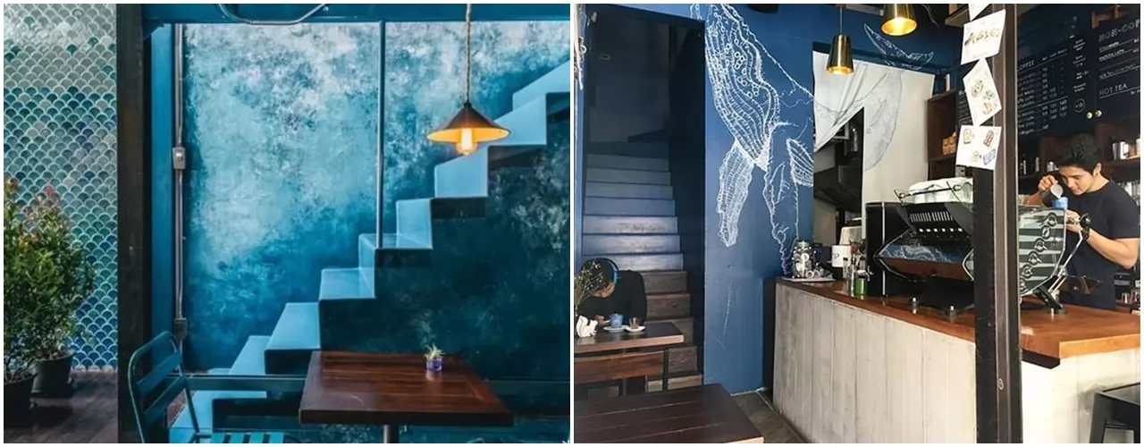 這間店是幾個泰國年輕人開的,從海底深處借取靈感,一改咖啡館傳統色調,顏色和環境氣氛都以海洋深藍為主題,創意的打造出一種寧靜而神秘的氛圍。牆壁上的藍色瓷磚濃郁深邃,高明度的飽和色調帶來清新優雅的氣息;店主親自操刀製作的鯨魚壁畫顯得恬靜空寂,仿佛能聽到深海中藍鯨的緩緩長鳴。