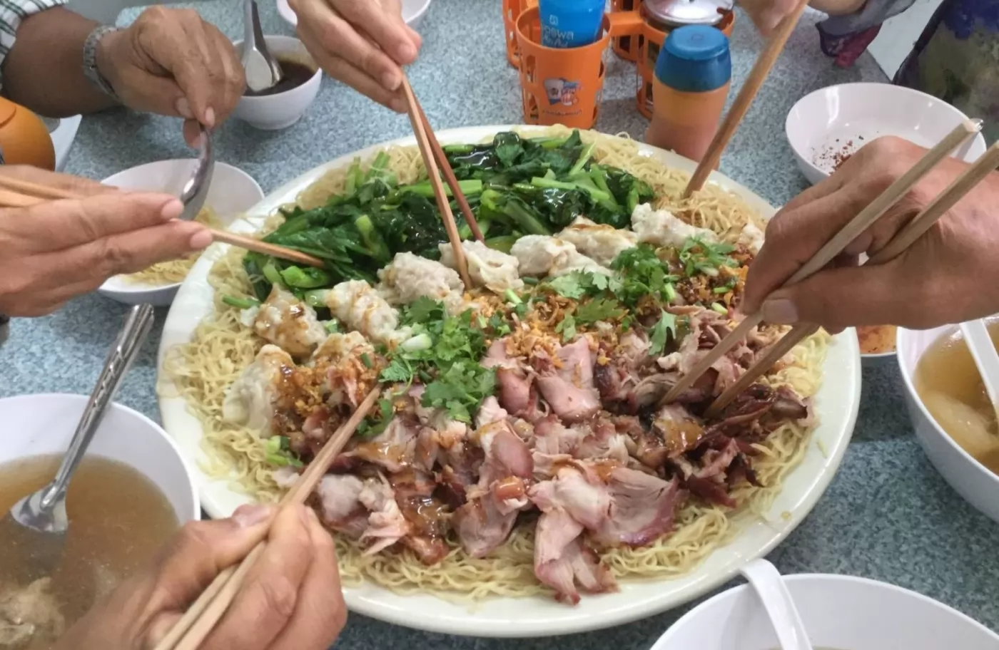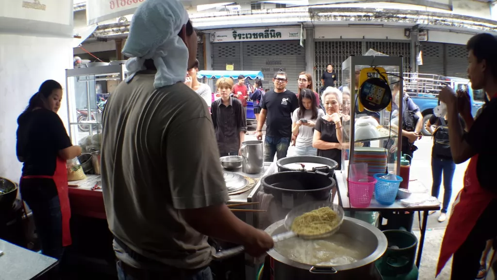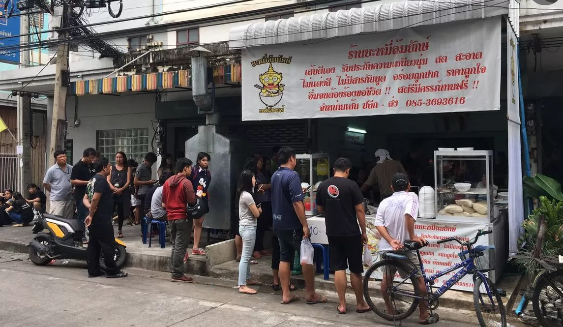 來看這邊,泰國暖武里府一家麵店LomYak Noodle(บะหมี่ล้มยักษ์),推出250銖超大份麵條,足夠5-6人吃,嚇嚇叫!店舖前隨時都有人排隊購買。
