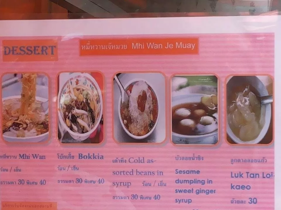 另外,涼/熱火甜麵綠豆湯、薑汁湯圓、糖漿棕果等,價格在30-40銖。