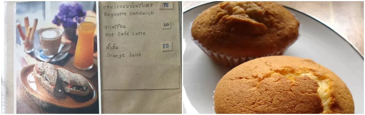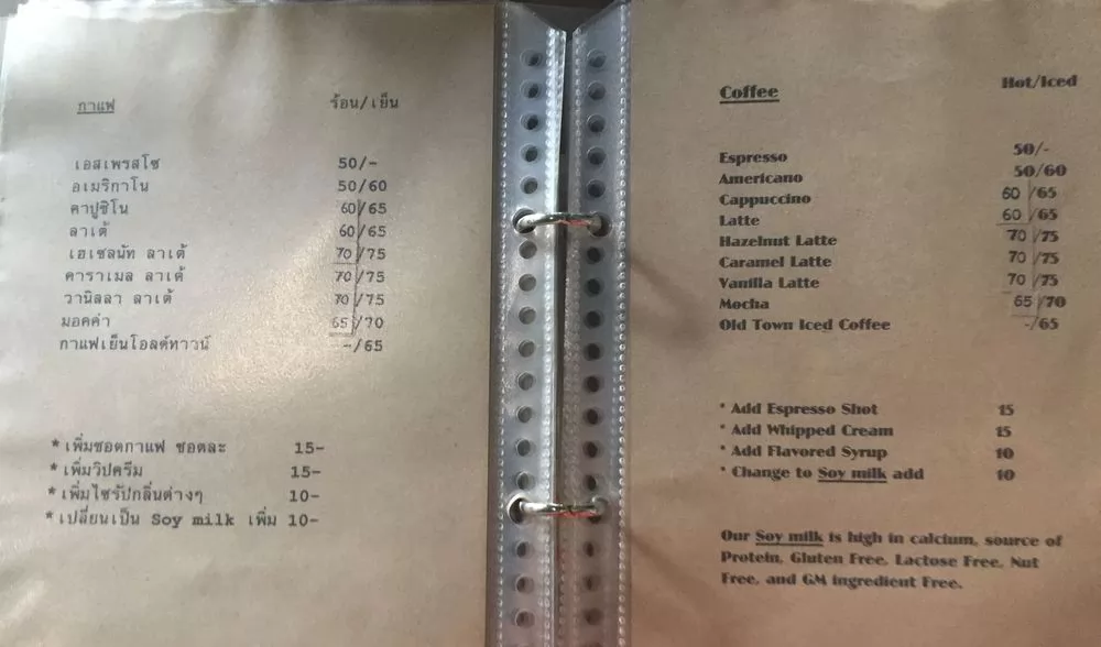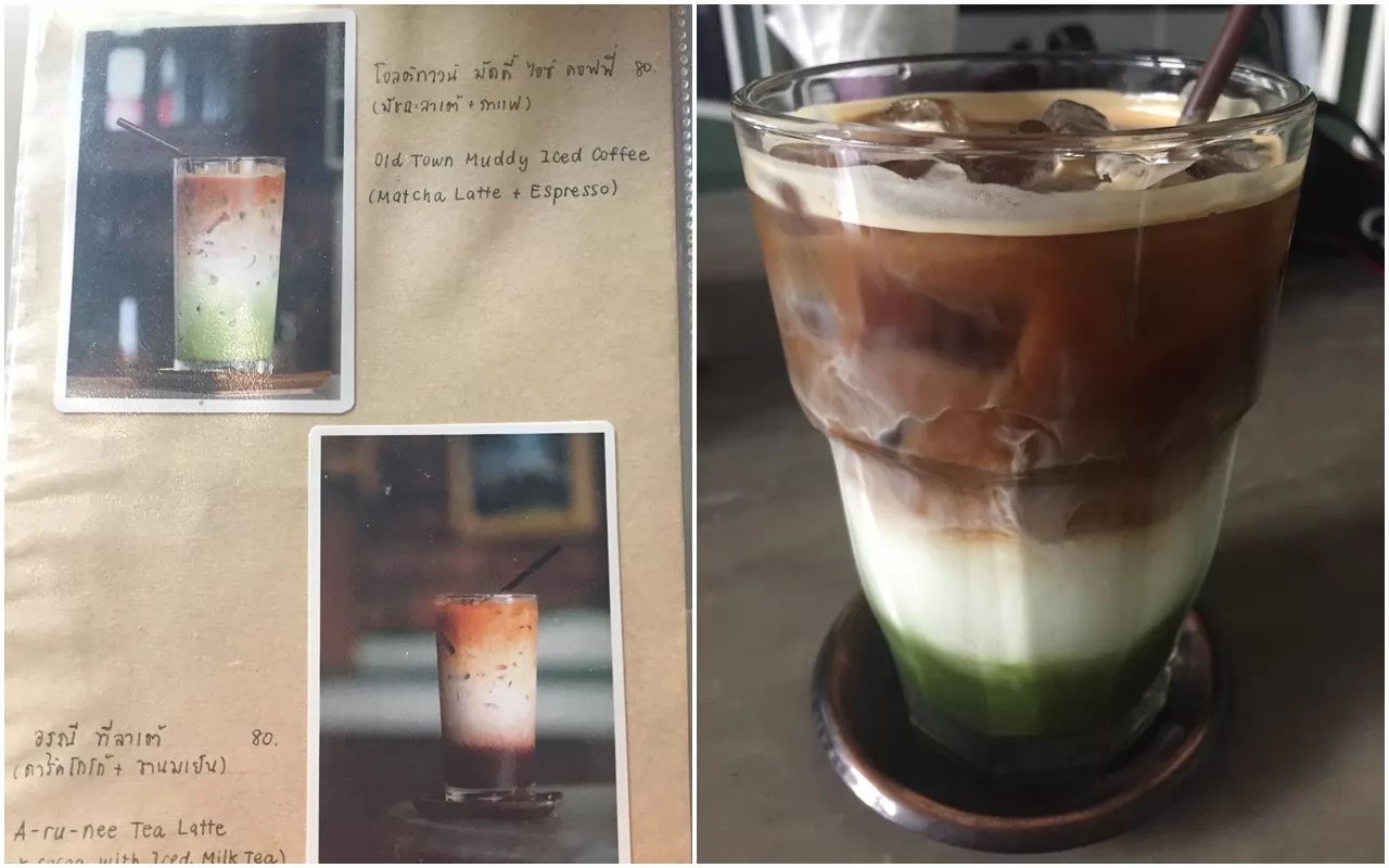 值得推薦的是Old Town Muddy Ice Coffee,是抹茶Matcha為底,再加Espresso)咖啡,形成綠色的抹茶在下、中間是白色的牛奶、上層咖啡色的三色飲品,喝起來很特別,牛奶把兩種味道融合,有點抹荼拿鐵味,1杯80銖。