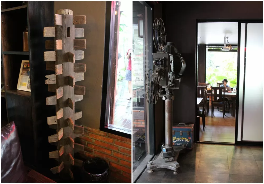 處處有木製的用具;另外一間會議室的座位,門前有座裝飾用的古舊放映機。