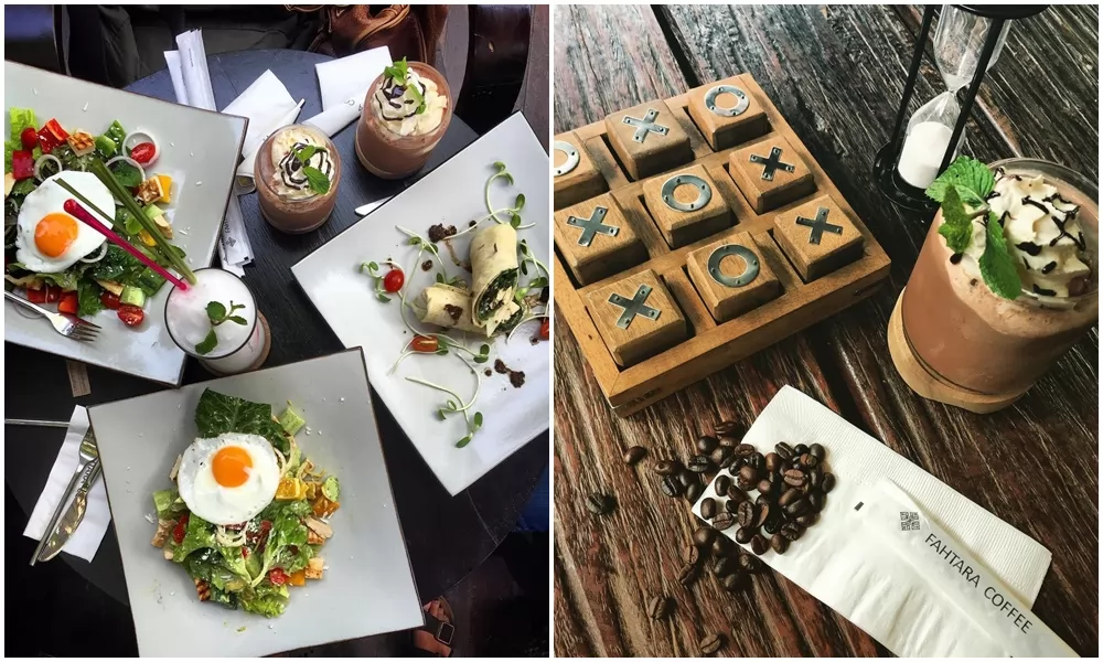 Fahtara Coffee佈置成園林,有池塘和水車。戶外用餐區,蘭納紅傘和泰北織紋的靠枕充滿泰北風情,即使是在熱天,空氣中噴著水霧,會帶來了清涼感。