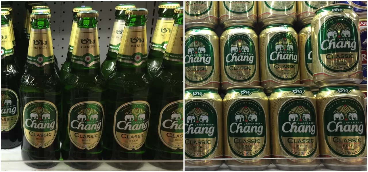 象牌(Chang Beer/เบียร์ช้าง)—兩隻大象面對面的圖像和綠色瓶身搭配金色的設計,是大家對象牌啤酒的第一印象。