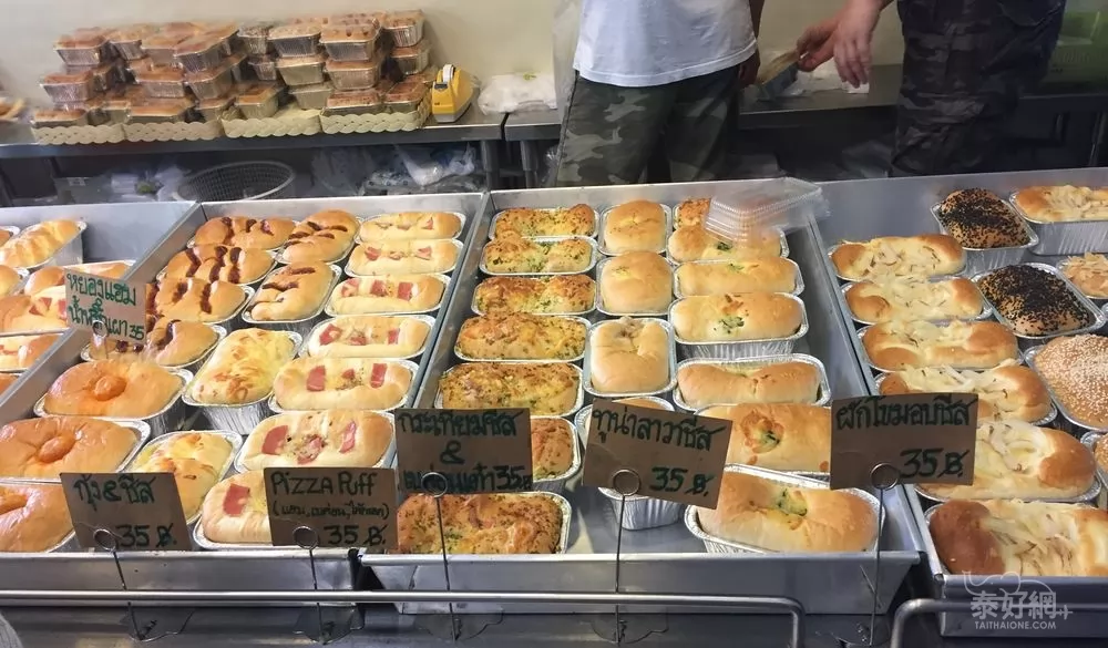 二是種類多,光是泰式長條麵包(有夾心)就有近10種口味(海鮮、火腿、椰絲、披薩等);蛋糕(巧克力、椰子、橙橘);千層酥(甜的和夾香腸);蛋撻等等不下50種,選擇多樣,滿足很多人的口味。