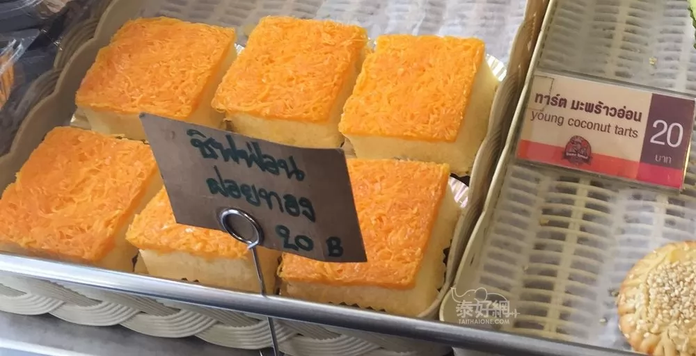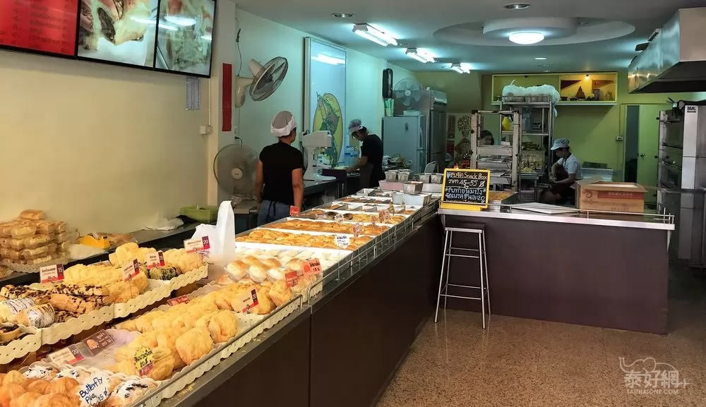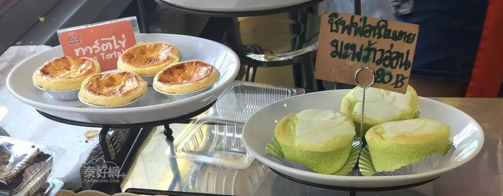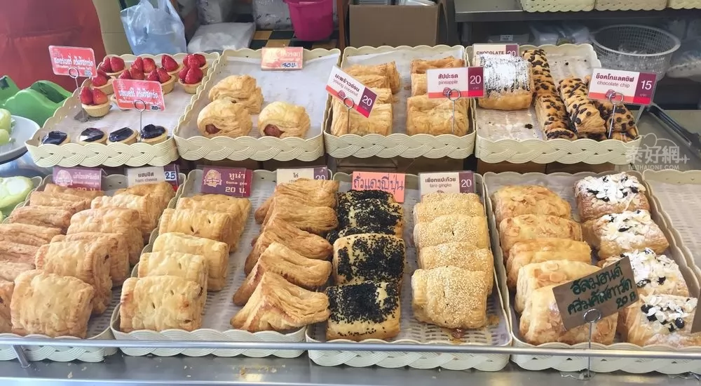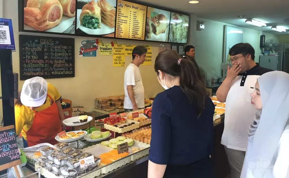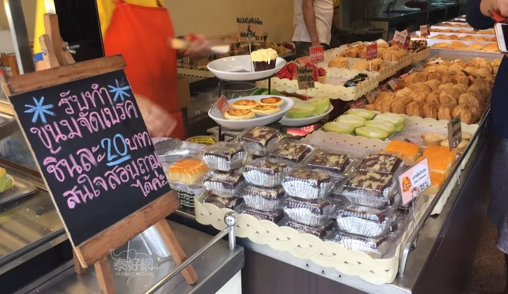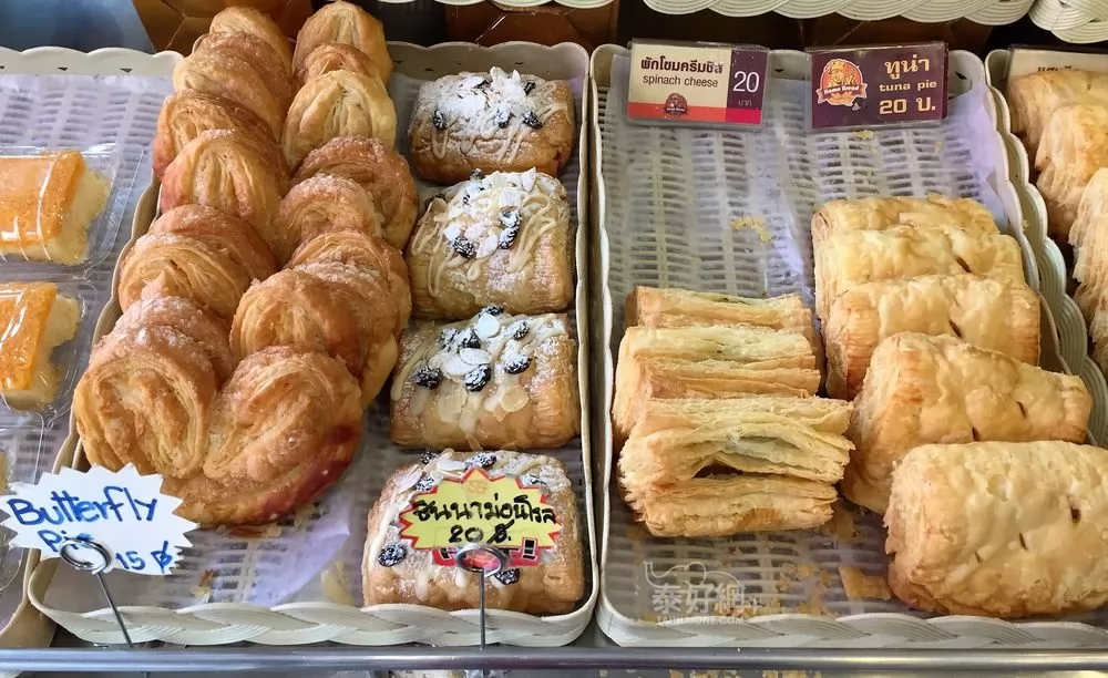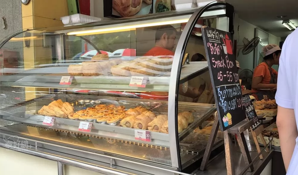 三是價位,長條麵包1條35銖;各式千層酥15-25銖1個;蛋糕1個平均20銖;蛋撻1個也是20銖,香酥脆,好吃!真的很平價,來店的人耐心排隊購買,幾乎都是帶著大包小包的東西離開。