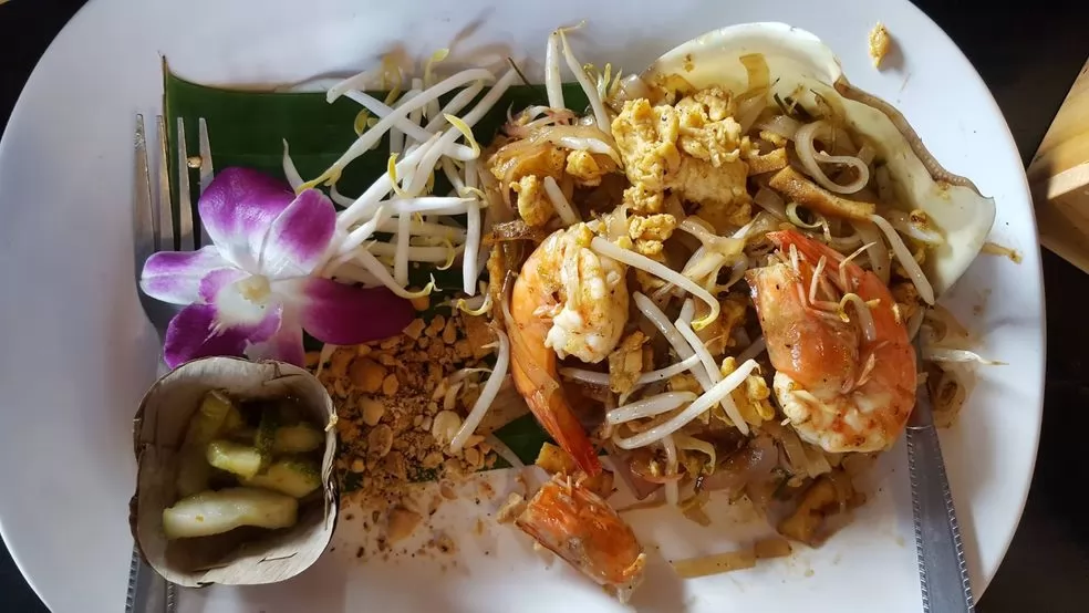 另外熱銷還有鮮蝦帕泰(ผัดไทยกุ้งสด),泰式炒粿條放在香蕉葉上,兩隻蝦,加上碎花生、豆芽,1盤70銖,不算貴,但量有點少,味道還OK!