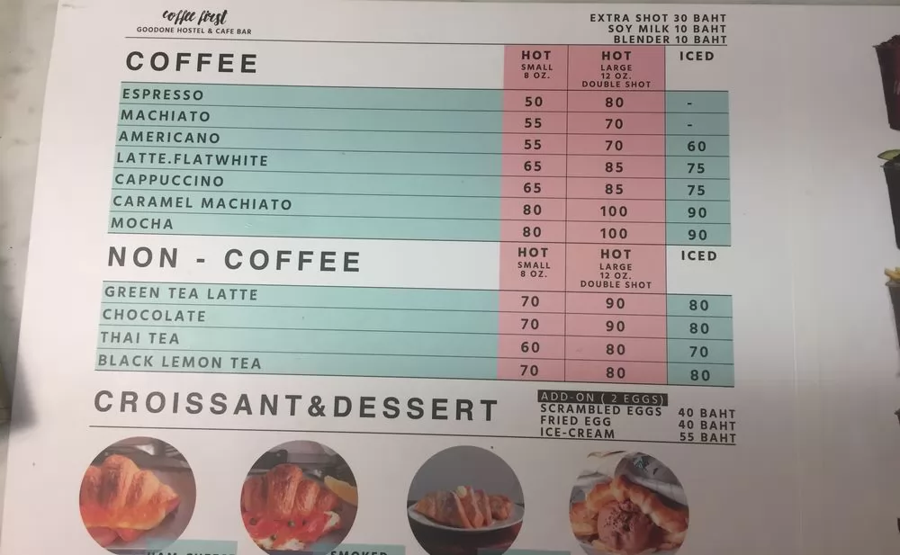 這裡的咖啡不貴,50-100銖,冰沙法樂皮則是130-140銖,可頌三明治也在100銖以下,若只是路過也非常適合進來喝杯咖啡。