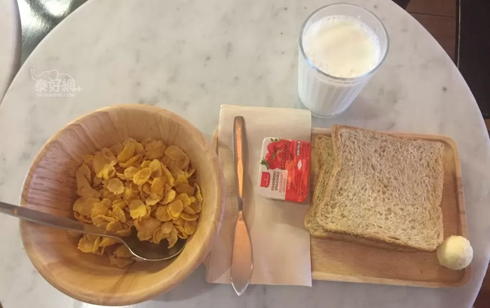早餐很簡單,1杯新鮮牛奶、1碗西式麥片、兩片吐司附奶油和草莓醬,足以吃飽、吃得營養,如果要點咖啡則需另外付費。