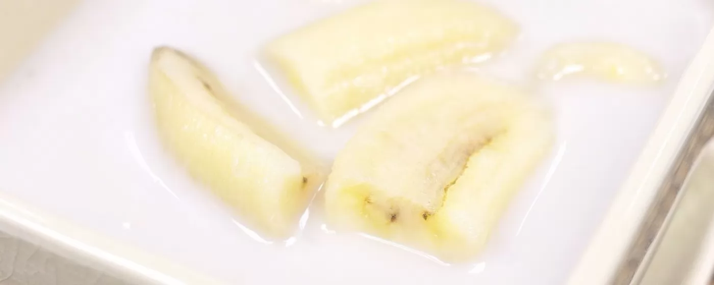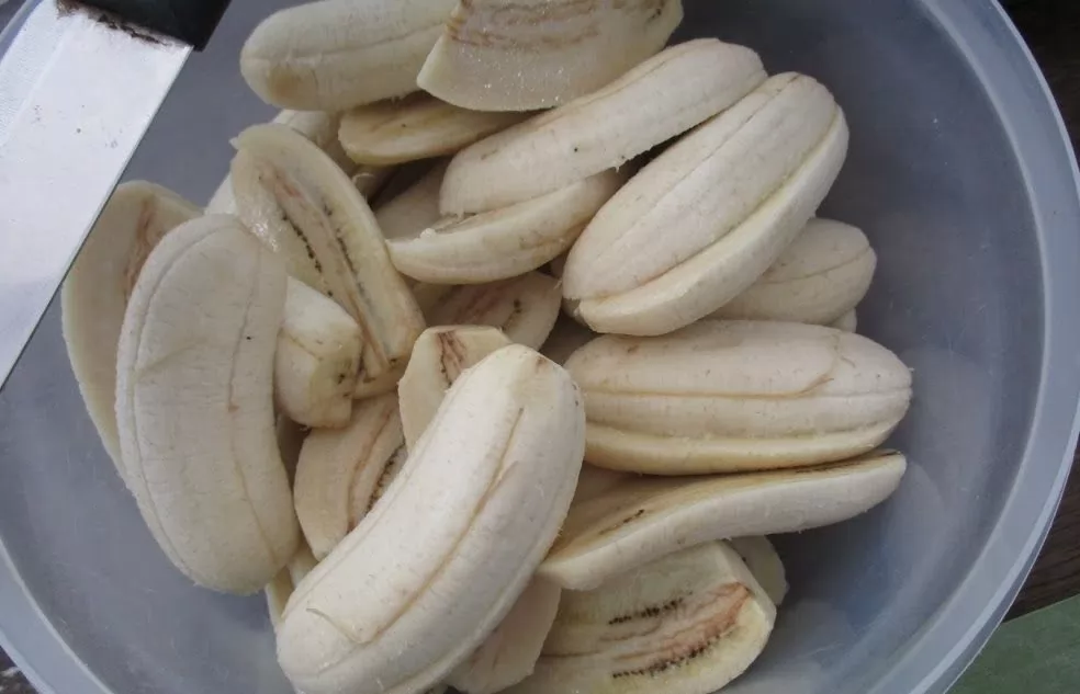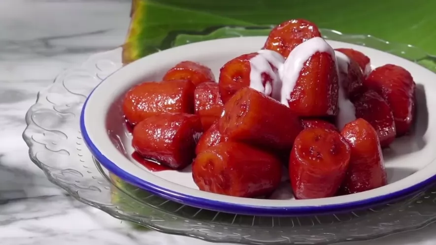 用糖漿漬過的香蕉,顏色變紅,十分甜,一般會淋上椰奶來吃。