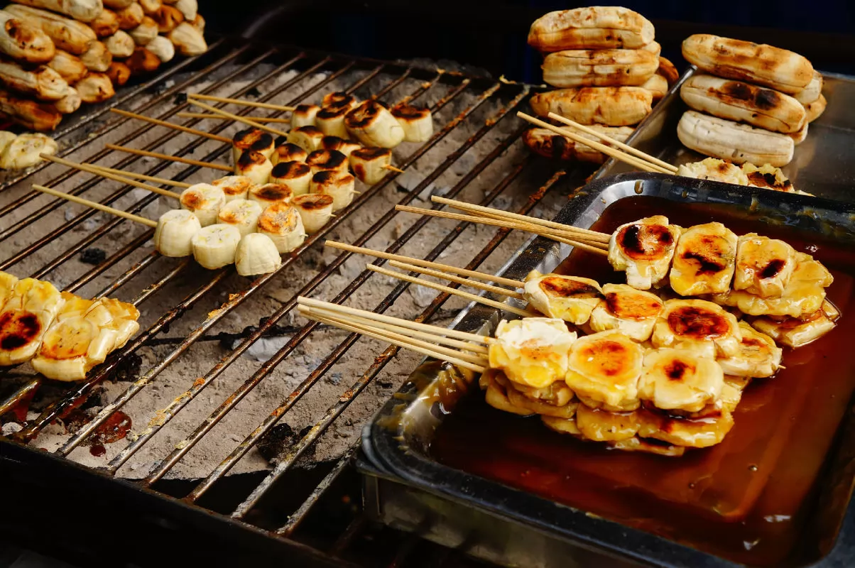 這個是泰國不帶皮的考香蕉,外酥裡嫩。價格5-10泰銖1串