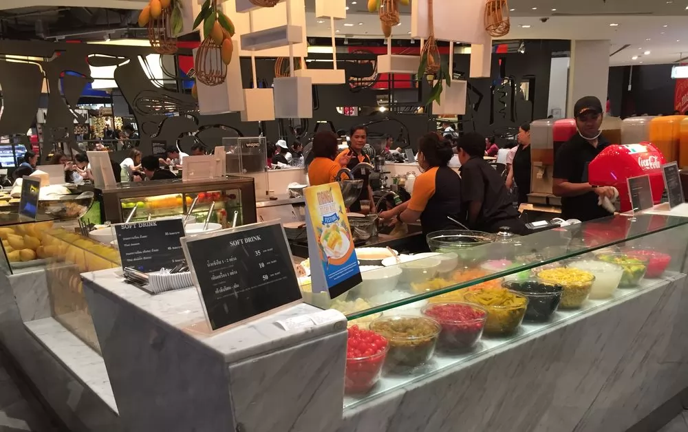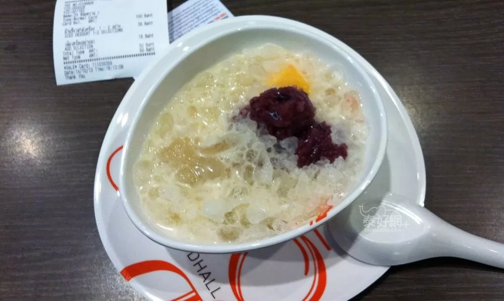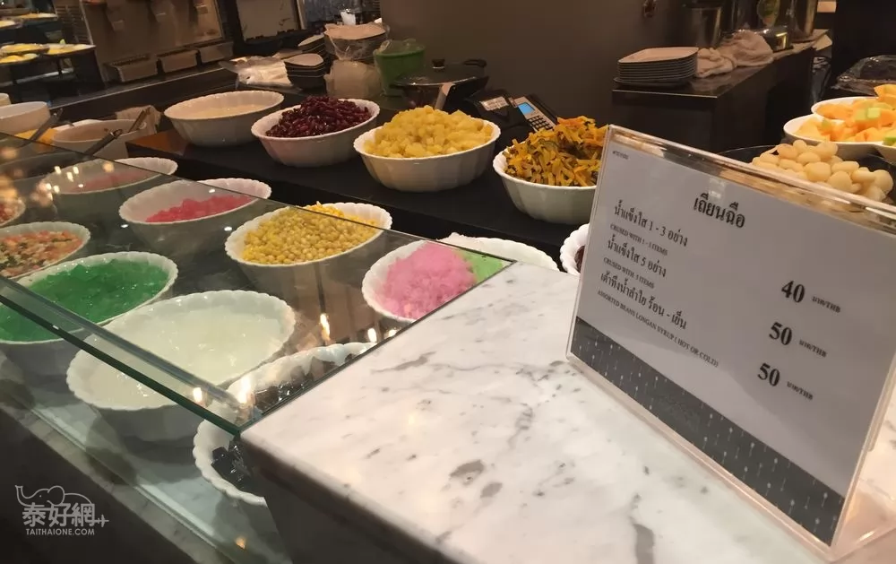 來到SIAM PARAGON的美食中心,需先去換等值的儲值卡,才能消費(冰甜點店不收現金),然後選配料,有瓜果(哈密瓜、香瓜)、蔬果(玉米、芋頭)、燒仙草、椰果、果凍、紅寶石、牛奶布丁、綠色的涼粉等等,奇特的有甜糯米、黑糯米、吐司塊,可以搭配的料數也數不清。