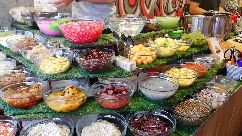 在傳統市場、百貨商場美食中心,你都可以看到泰國椰奶冰甜點,各式各樣的配料,五花八門,色彩鮮豔,光看就讓人流口水啊!吃起來更不用說啦。