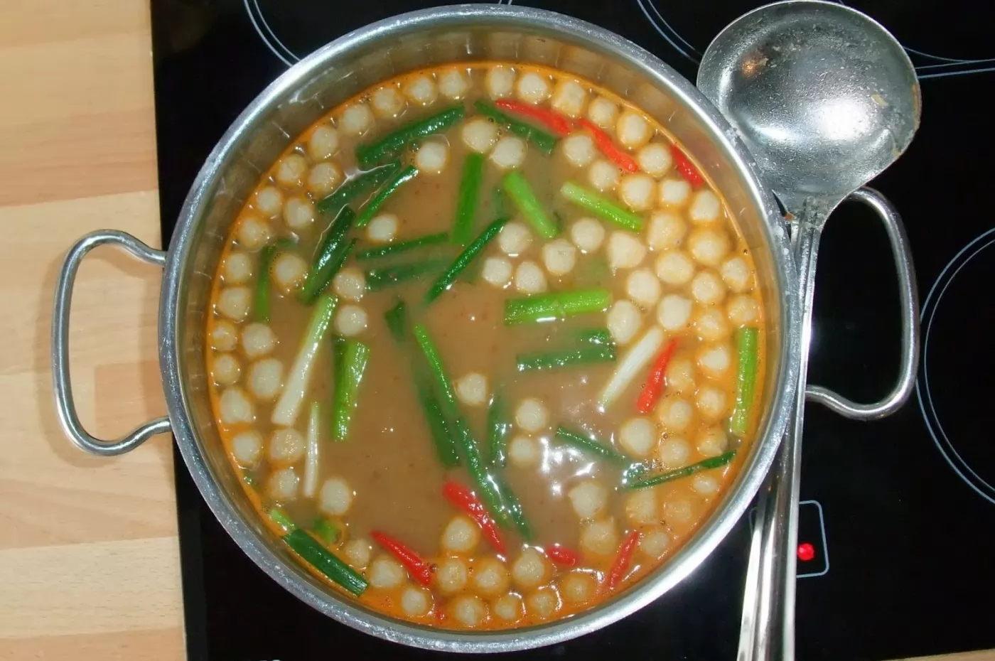 湯底是將泰國鱧魚(ปลาช่อน)煮成細肉絲,加上泰式臭魚醬、小米椒、泰式香料熬成一鍋中等濃稠的湯汁,辣而鮮美,不吃到泰國臭魚醬怎麼算到泰國?!