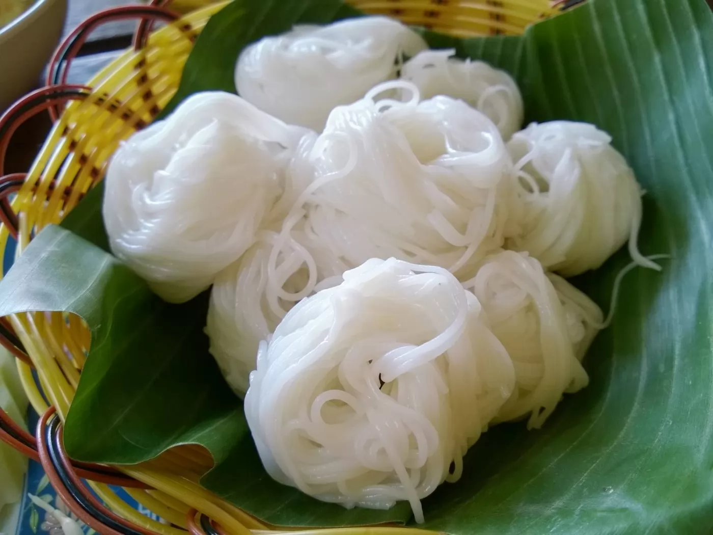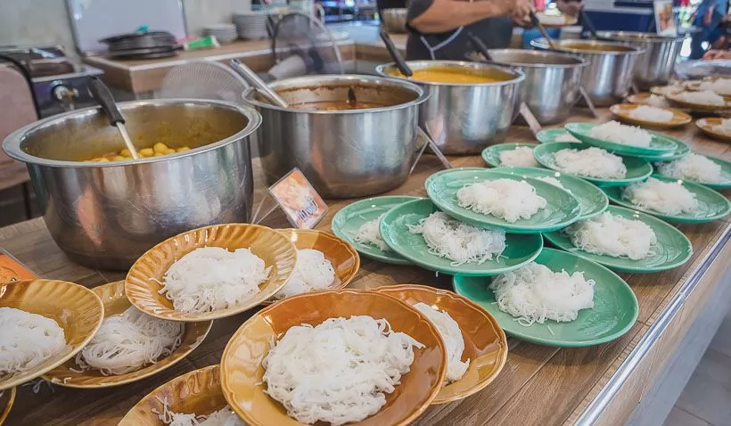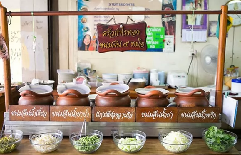 泰式涼米線(ขนมจีน),發音為「考濃金」。在路邊、市集廟會、百貨商場容易找到這平民吃食,幾大鐵鍋或是土鍋放在攤前,八九不離十就是在賣泰式涼米線。