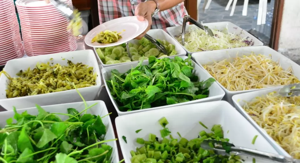 然後,再依個人的喜愛,加包白菜、黃瓜、醃菜等9種生菜搭著吃(基本上是無限量的仍客人加),這樣才能真正吃到這項泰式食物的美味。