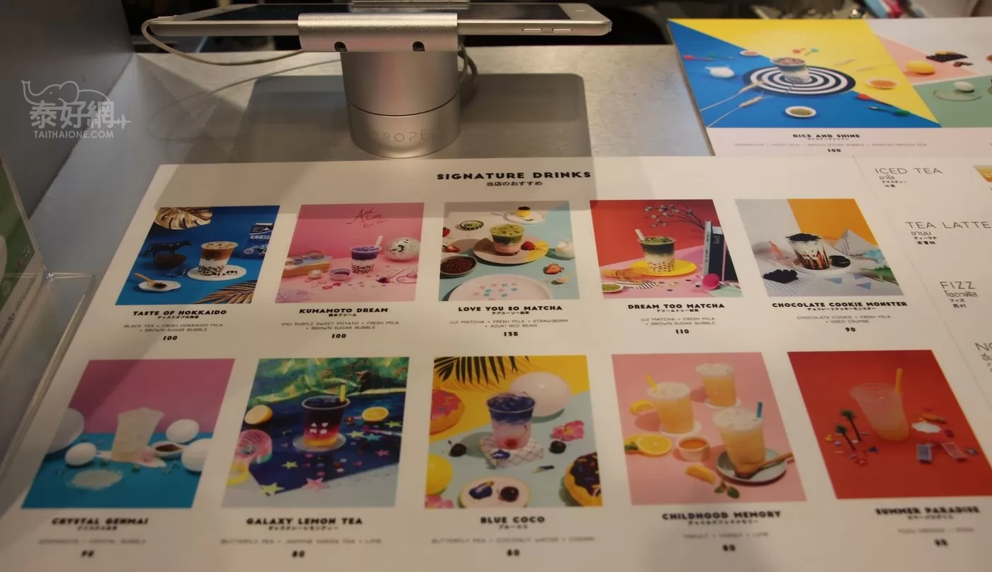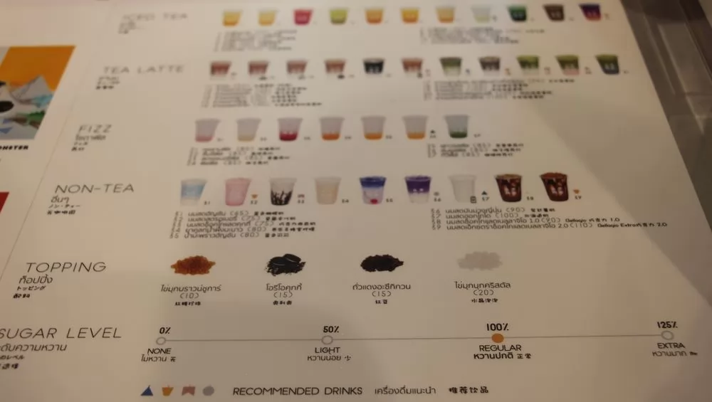 妖妹看到飲料選單,發現有台灣和日本飲料店的影子,除了有中日英文,還有甜度的區別(無糖、50%半糖、正常100%糖、超甜的120%糖),種類超多,有冰茶、拿鐵、奶茶、果茶待4大類別,價位在45-120銖之間。