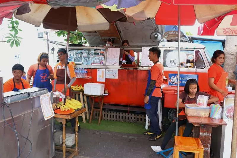 這裡有個喝咖啡的小攤位,消費很便宜,飲料價格35-65銖之間,冰沙則是40-50銖。冰甜點、果汁、冰咖啡等都是在一輛橘色的麵包車上製作,這也是最大亮點。