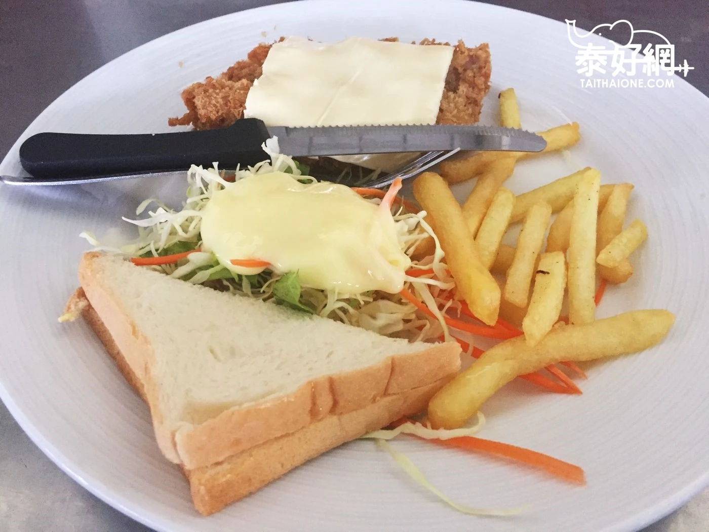 體重破表的象哥這次則是為了形象,束縛起小腹,只點正常1人份的炸雞排套餐,有一片夾蛋的三明治、薯條、生菜沙拉、加了一片起司的炸雞,這樣1份才79泰銖,哇。。啦啦,怎麼這麼超級的便宜!忍不住又要再點1份....