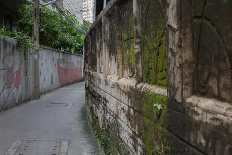 青苔從地面一路爬到墻面,跟另一邊的塗鴉配出一張絕佳的背景墻,成了很多文青拍照打卡的必經之地。