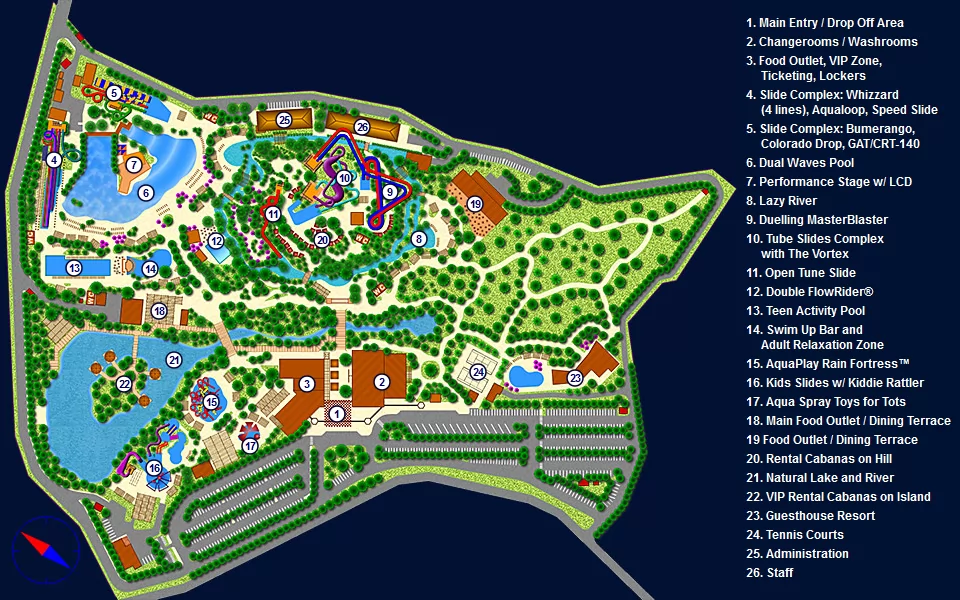 園區內分7個不同設計不同特色主題的區域,可體驗21座精彩無限又別致獨特的水上項目,既有尖叫不止的驚險刺激,也有微風拂面的悠閒愜意。
