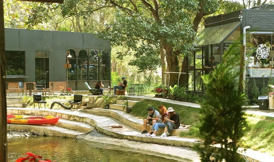 真正踏進去,你會看到更令人驚嘆的空間。不是傳統的一屋一店,圍繞著水池邊的還有各種充滿設計感的木屋、玻璃屋、皮艇、復古車和滑梯,可以勾勒出一幅幅很優美的畫作。