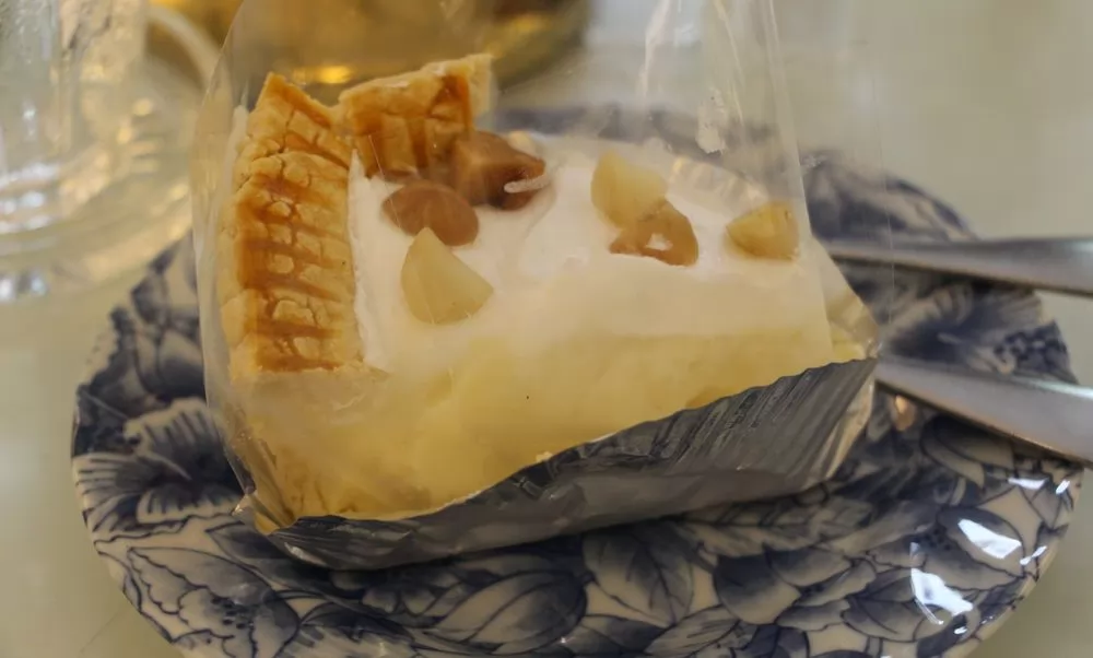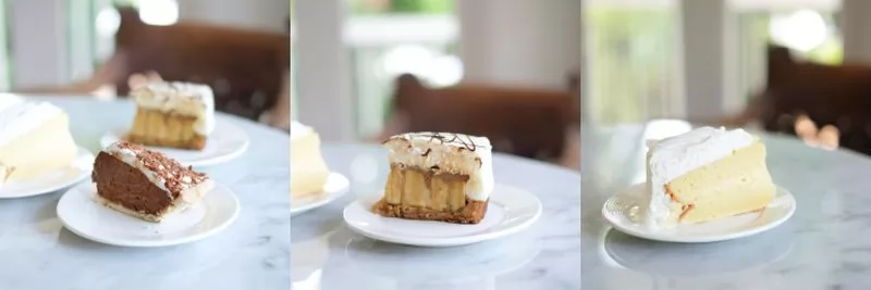 多種手工製作的蛋糕,75到95泰銖,椰子奶油派的蛋糕(90銖),綿密卻不膩口,上頭抹上一層雪白鮮奶油,並以些許杏仁角點綴,蛋糕下的派皮十足香脆。