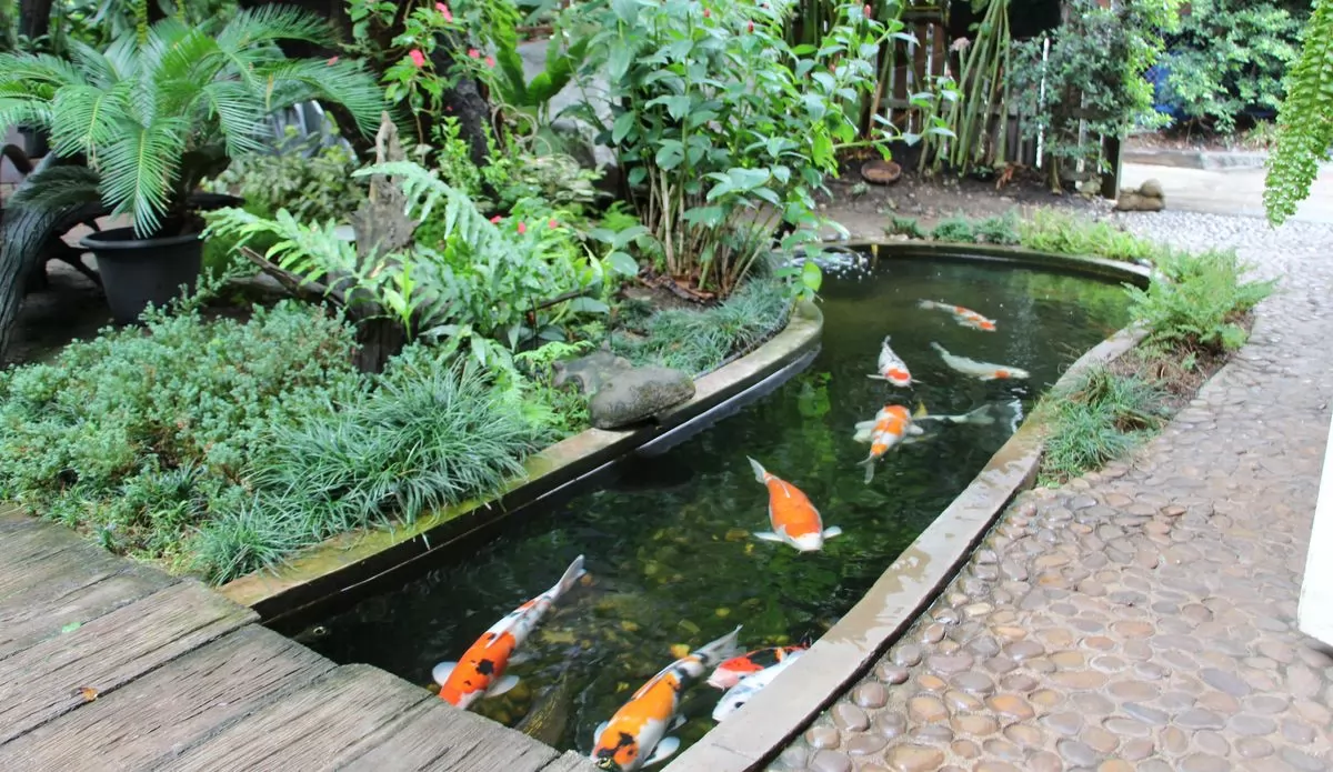 Fern Forest Cafe外觀相當低調,白色獨棟建築上頭爬滿青綠藤蔓,周圍種滿蒼翠繁茂的植物,錦鯉池裡面養著非常漂亮的魚。