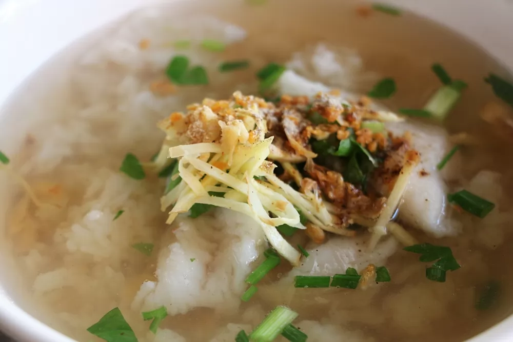 魚湯泡飯(1碗45銖)也很特別,魚片蒸得白嫩,加上醬料,好吃,另搭配的薑絲、蔥花和炒香的蒜花,口感更是豐富,很快就掃光。