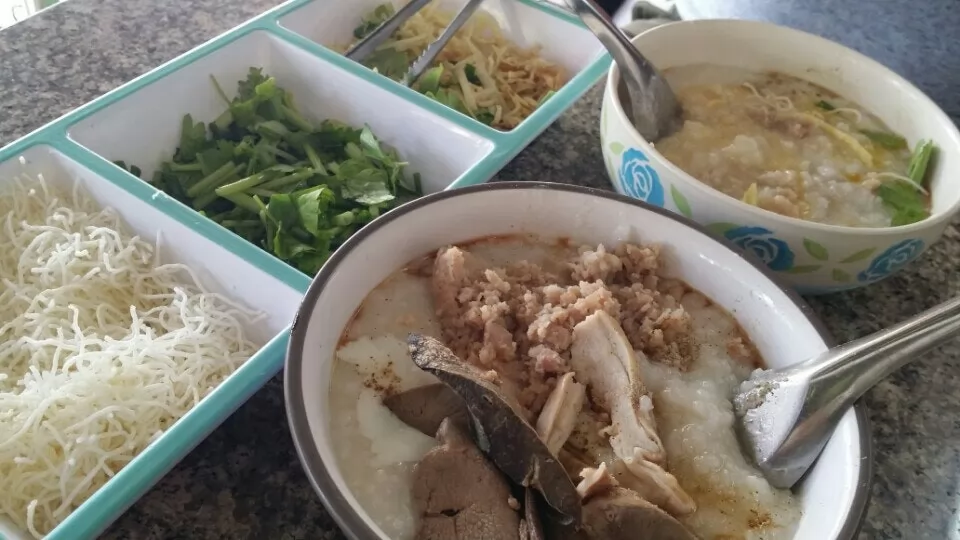 豬肉+內臟粥很受歡迎,薑絲、蔥花等配料自加。