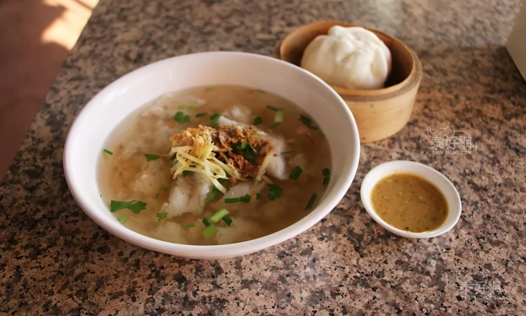 店開到現在已傳到第3代,這裡最有名的就是豬血湯,中式早餐有燒賣、包子,粥和魚湯泡飯,肉包子1個10銖,豬肉+甜腸,料好實在,好吃!