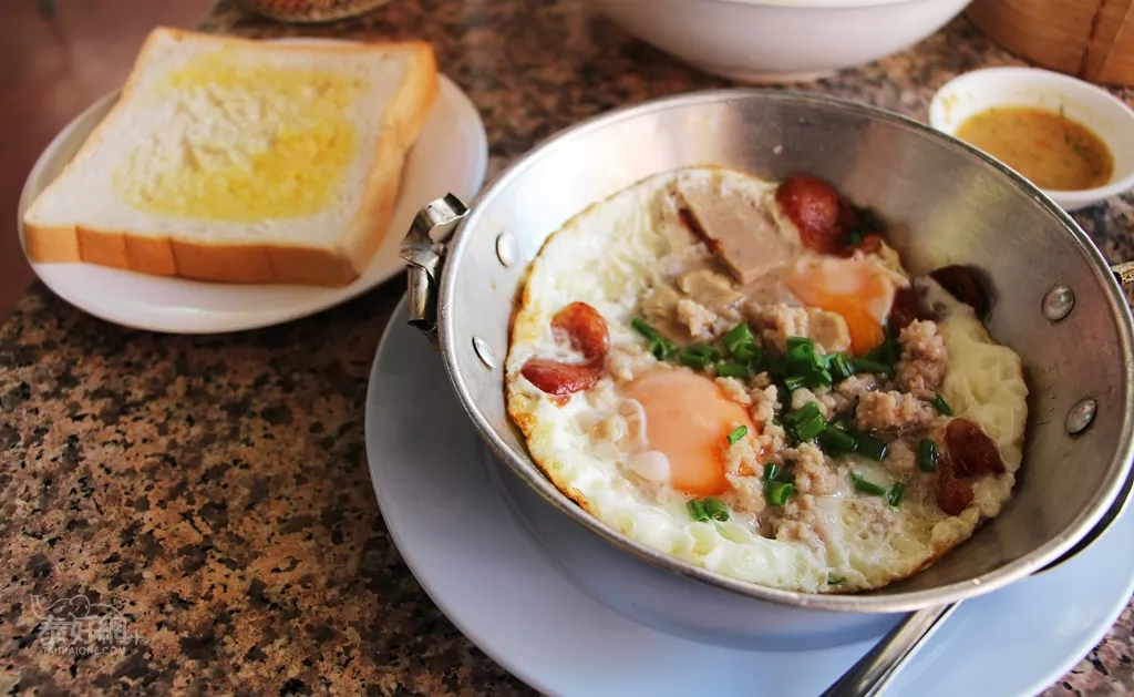 泰客吃完中式早餐還不夠,改換泰式,這裡也有傳統經典的Kai Kra Ta (ไข่กระทะ),煎蛋,肉碎,煙肉,再配上香腸,灑上胡楜粉,美味!1份55銖。
