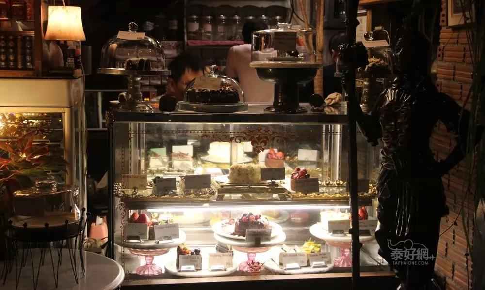櫥櫃裡的蛋糕,看起來就像是閃閃發亮的寶盒。這裡的蛋糕和點心都是手工製作,每一件都像是藝術品,價格從200-380銖之間,店裡的甜品會根據食材季節做調整,當天有什麼品味就全靠運氣了。