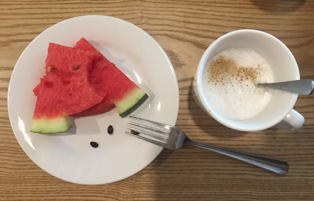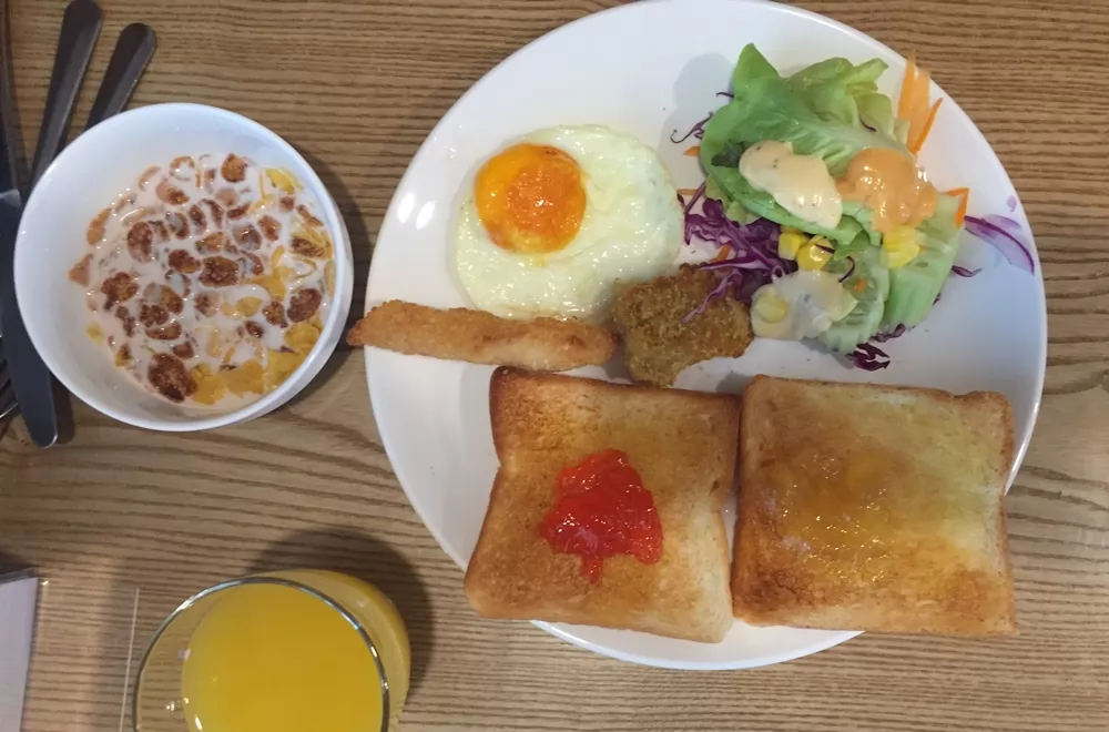 另外值得大力喊讚的是早餐(含在住宿費裡),7:00-10:30的時間裡,可以到頂樓的交誼廳享用,西式的牛奶麥片、烤吐司、沙拉、火腿、煎蛋,果汁、拿鐵咖啡和水果,真的豐富營養,為接下來的滿滿行程儲備好戰能。