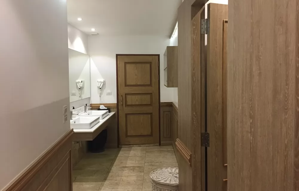 這家新青旅,從設計上看,沒有任何傳統色彩,各色木板變著花樣地從地板貼到天花,就連浴廁的馬賽克也是木頭色的。