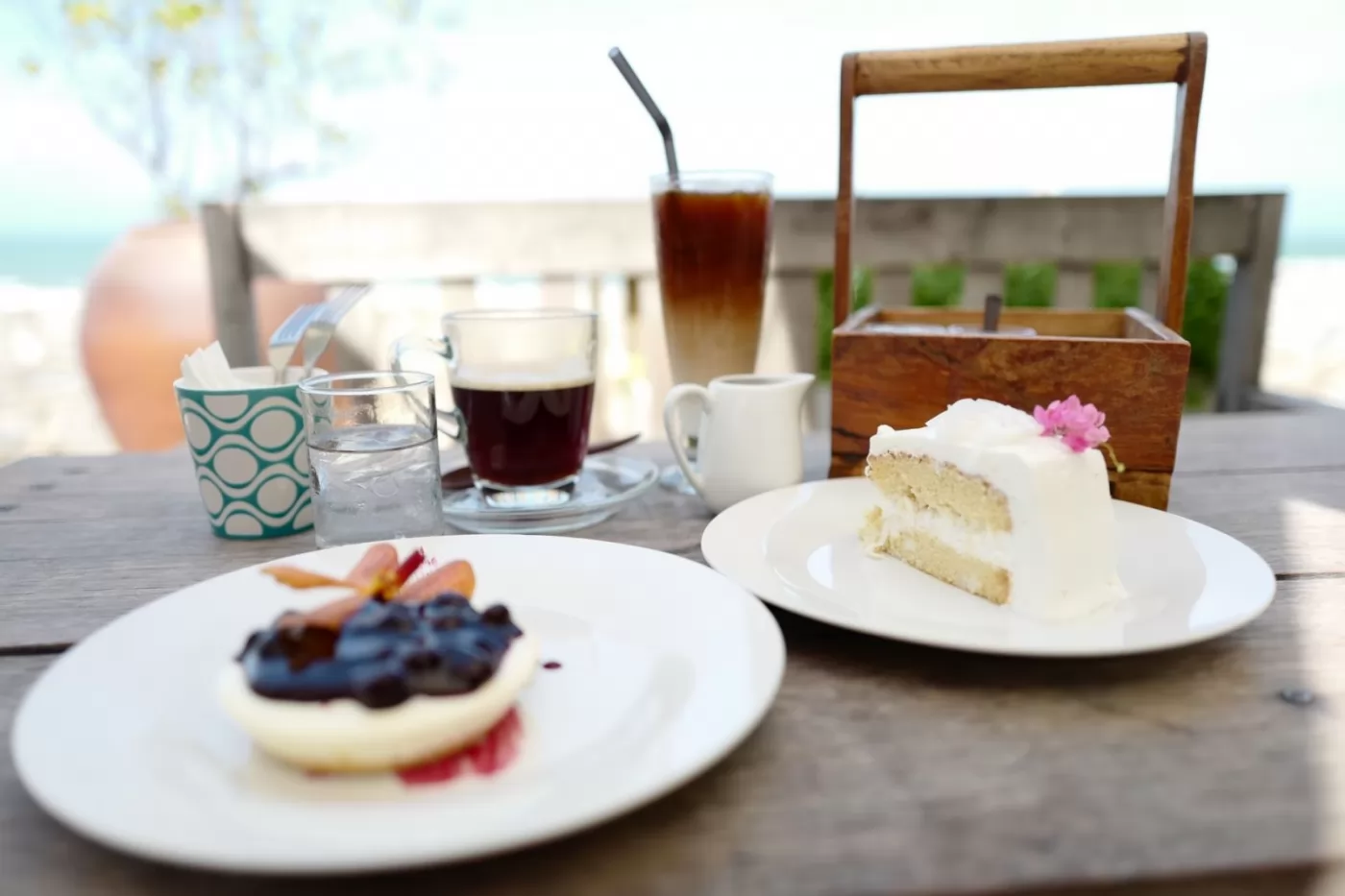 戶外的桌子+太陽傘,外面就是海灘了!非常有情調的喝下午茶的地方。